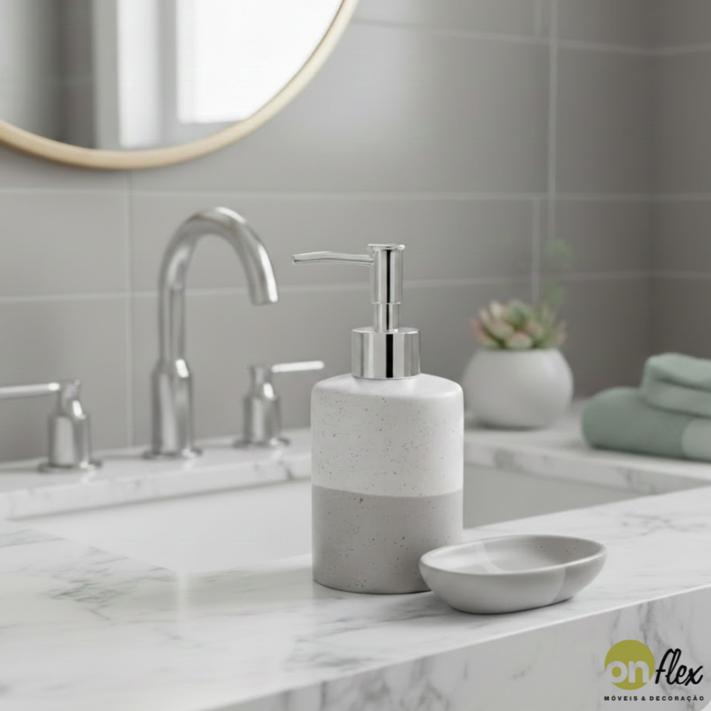 Com um degradê de tons cinza sofisticados, este conjunto adiciona um toque de elegância contemporânea ao seu espaço de banho.