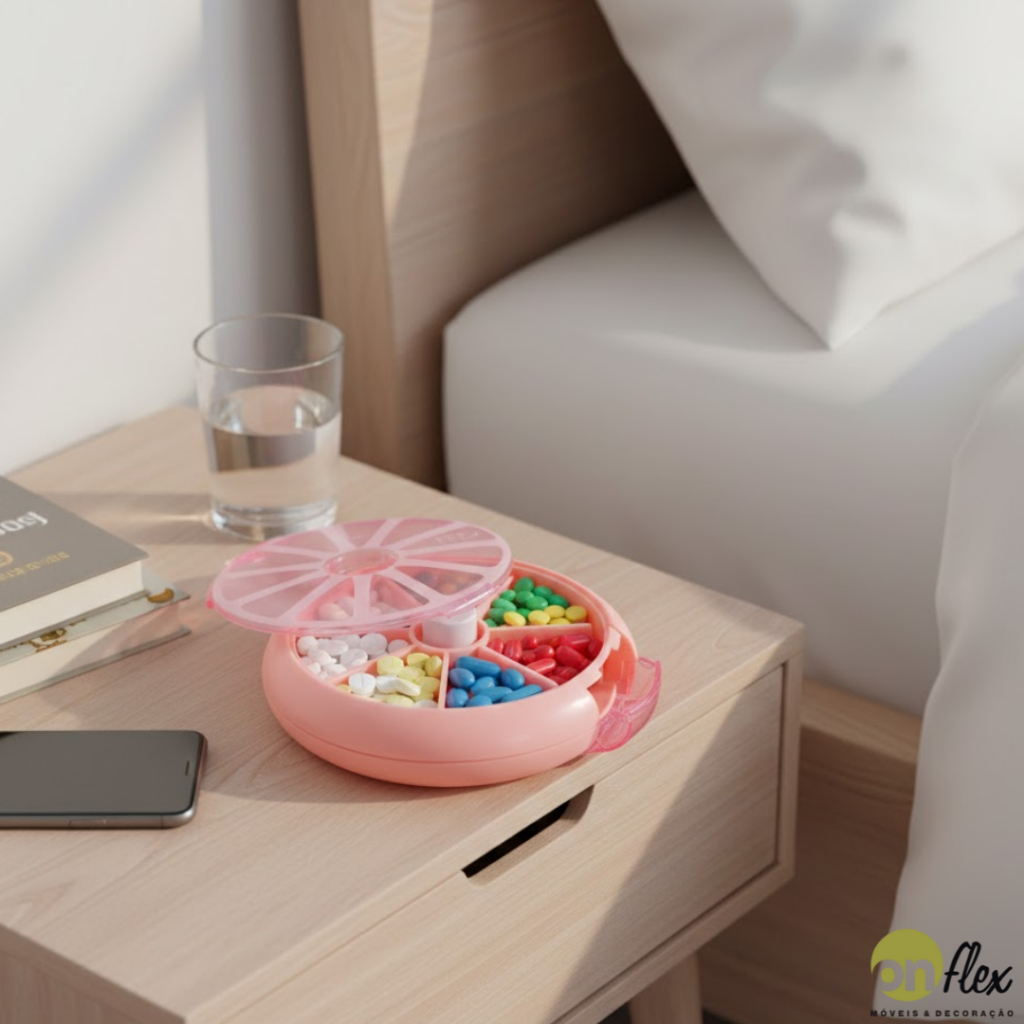 Com um mecanismo giratório, este porta comprimidos permite o acesso fácil e rápido aos compartimentos individuais, tornando a organização e administração de medicamentos mais eficientes.